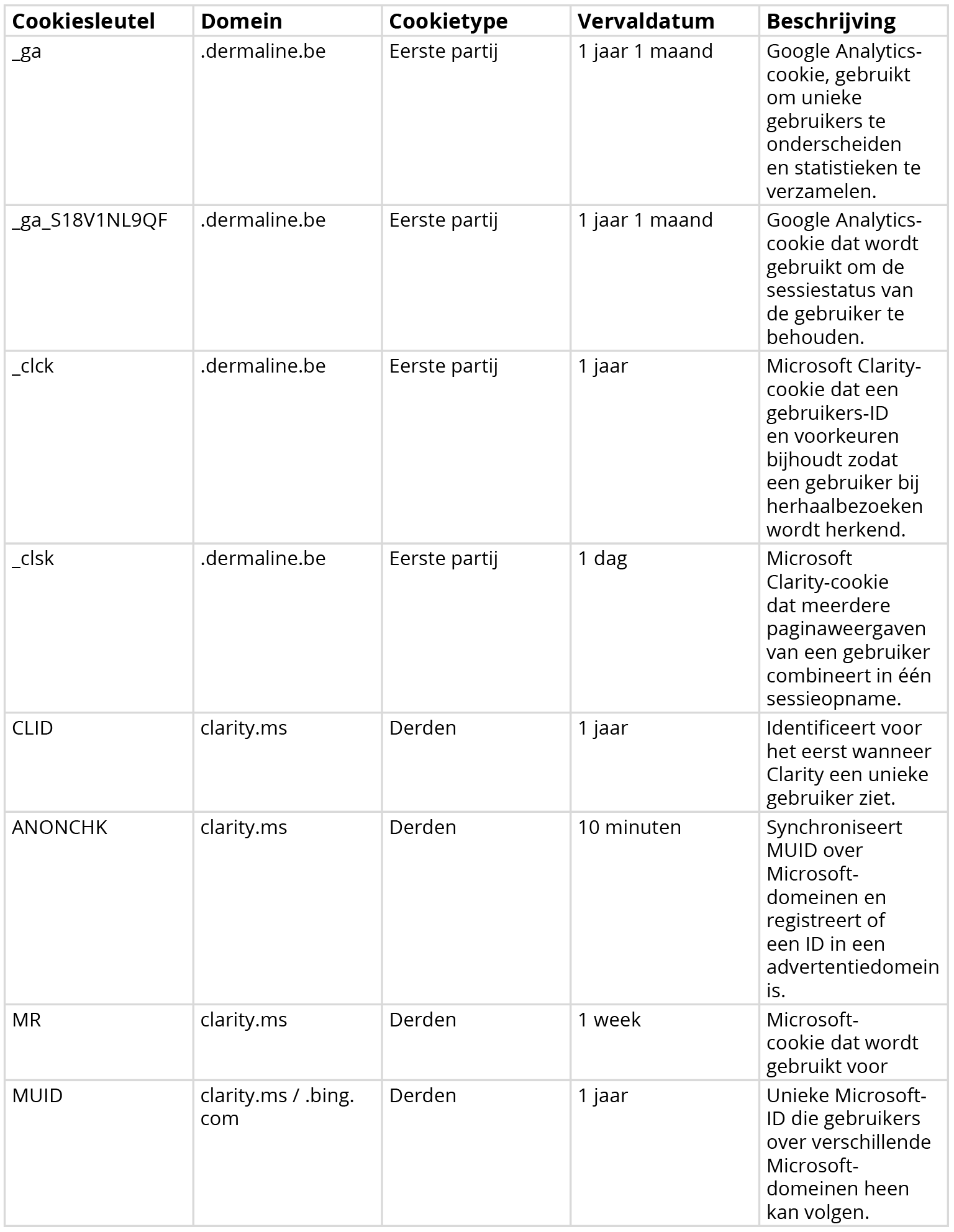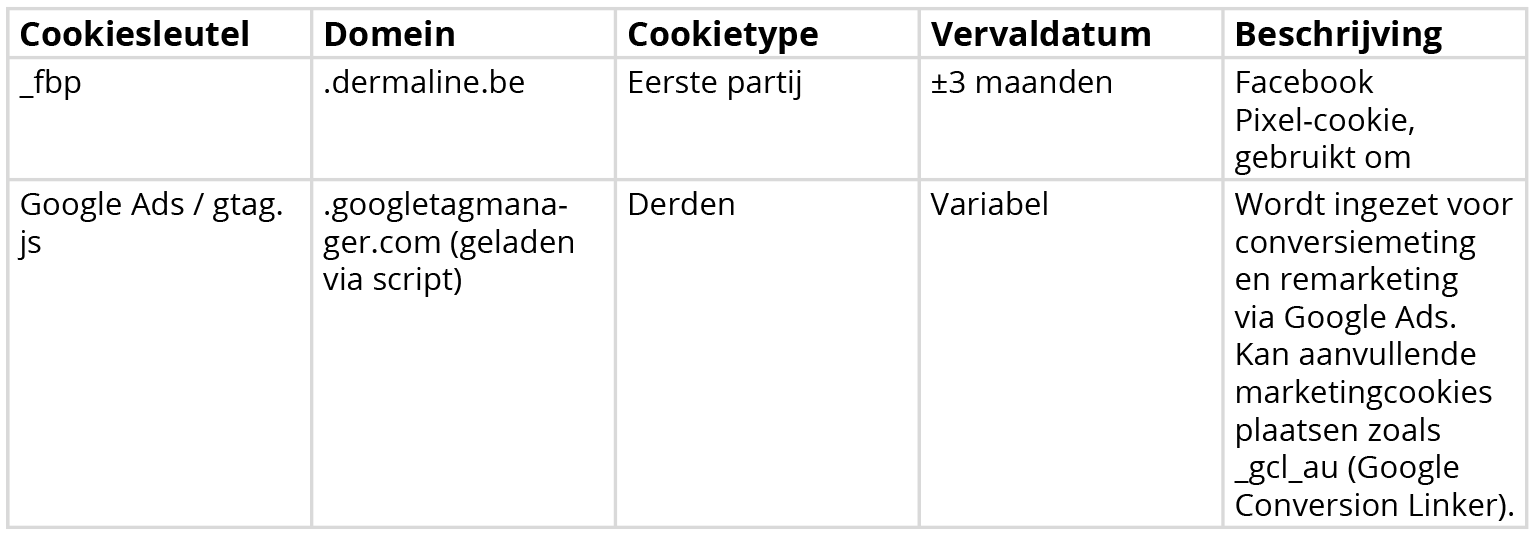 Welke cookies gebruikt Dermaline, voor welk doel en wat is de geldigheidsduur?