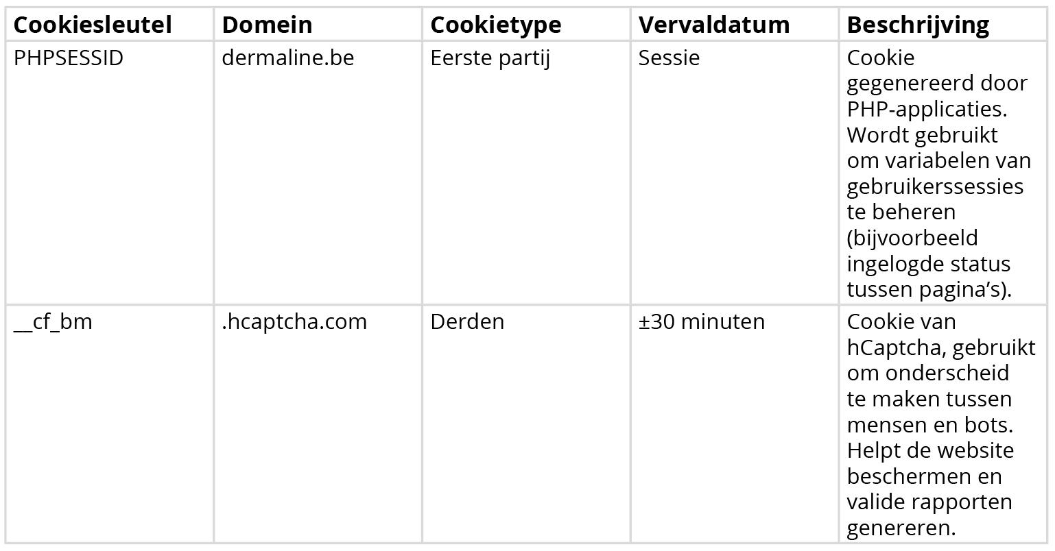 Dermaline gebruikt volgende noodzakelijke cookies: